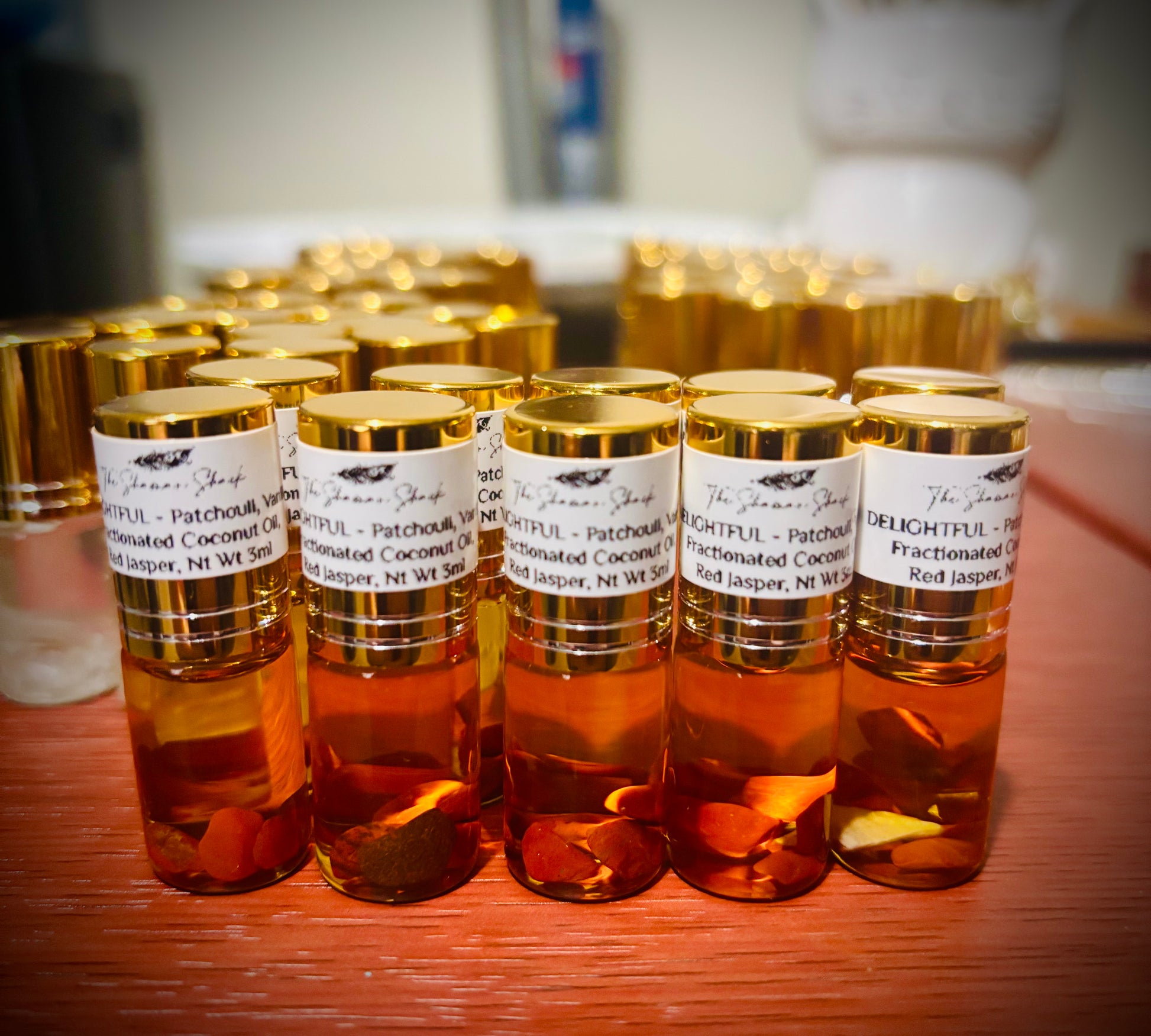 Various Essential Oil Blends and Fractionated Coconut Oil with Crystals & Stones.